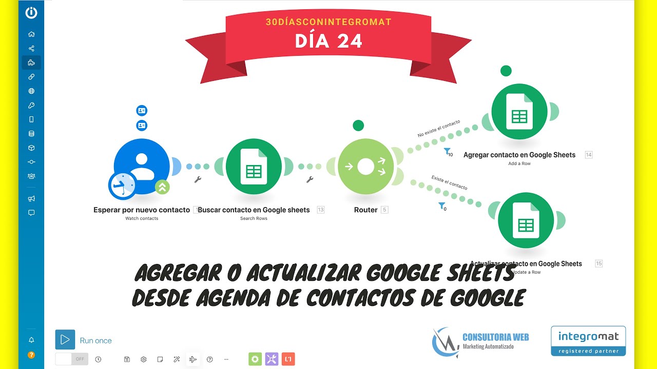 Este nuevo episodio del tutorial de 30 días con Make (ex Integromat) trata sobre monitorear nuestra agenda de contactos de Google y registrar los nuevos contactos o actualizaciones que se realicen en ésta, en una planilla de Google. Es decir, antes de agregar el nuevo contacto, el escenario va a buscar si éste ya existe en la agenda, y en caso de que exista, actualizará la nueva información.